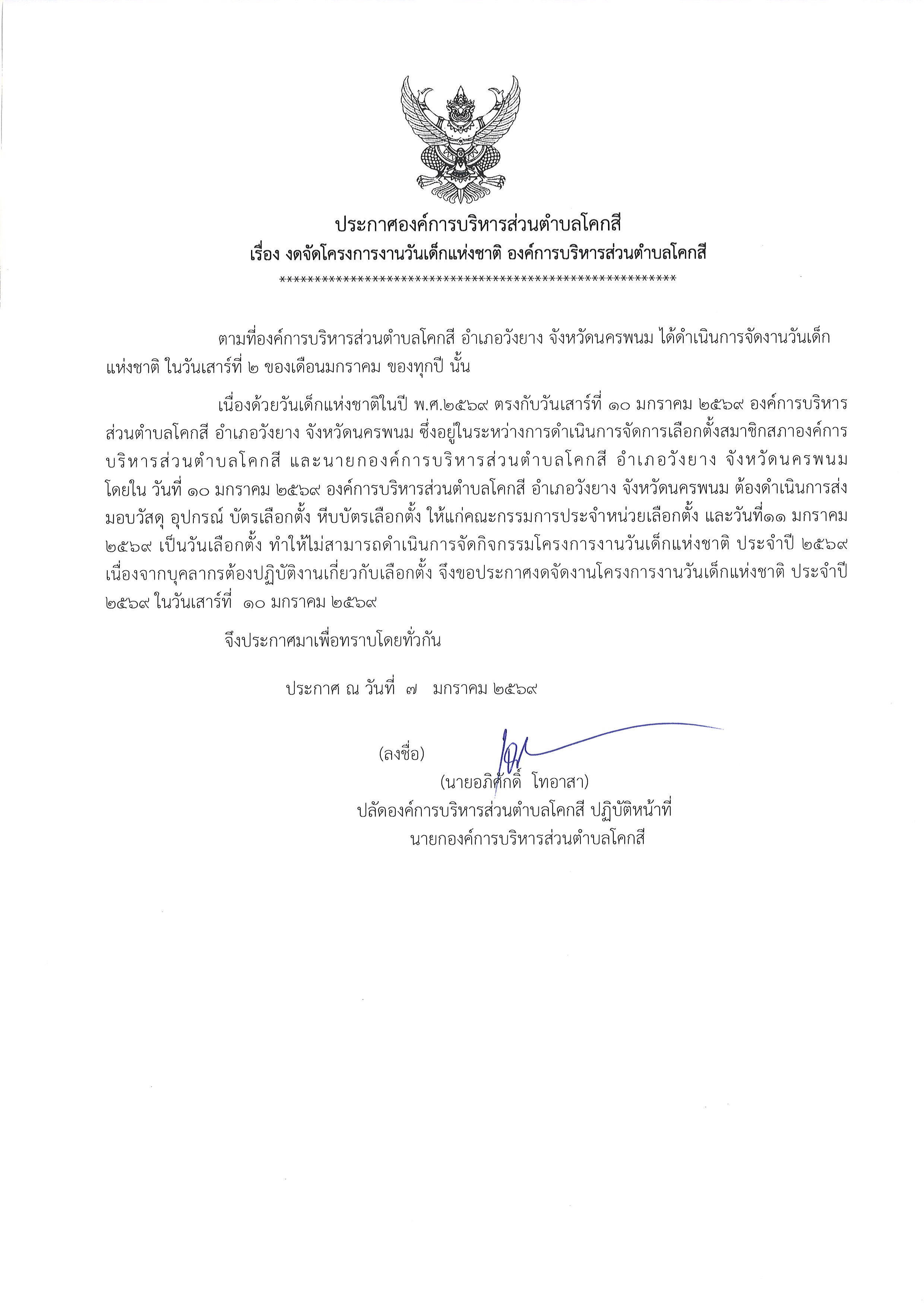 ประกาศองค์การบริหารส่วนตำบลโคกสี เรื่อง งดจัดโครงการงานวันเด็กแห่งชาติ องค์การบริหารส่วนตำบลโคกสี