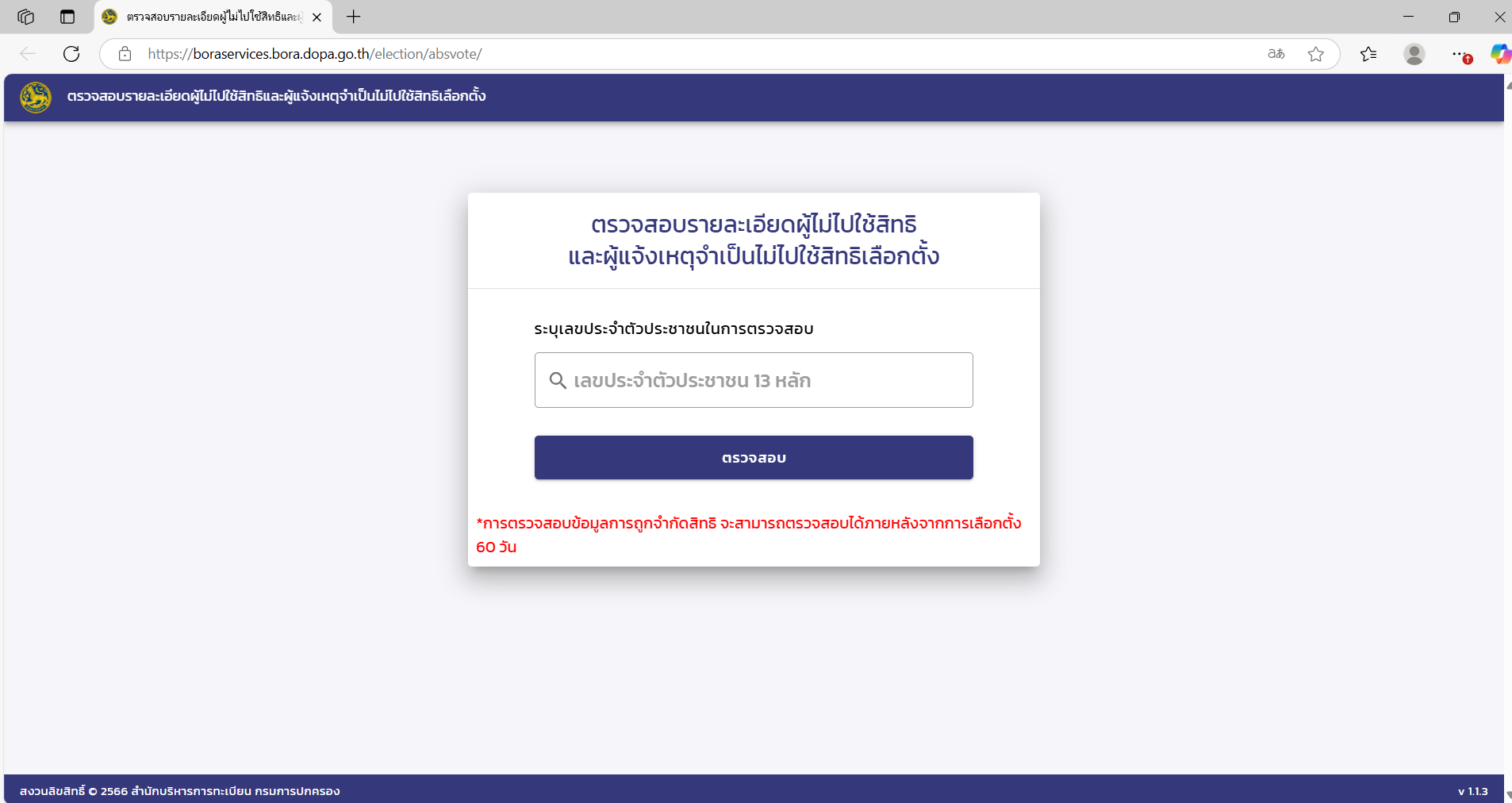 รายละเอียด : การประกาศบัญชีรายชื่อผู้มีสิทธิเลือกตั้งที่ไปใช้สิทธิเลือกตั้งและมิได้แจ้งเหตุที่ไม่อาจไปใช้สิทธิเลือกตั้งหรือแจ้งเหตุที่ไม่อาจไปใช้สิทธิเลือกตั้งแล้วแต่เหตุนั้นมิใช่เหตุอันสมควร สามารถตรวจสอบด้วยตนเองได้จากเว็บไซต์ : https://boraservices.bora.dopa.go.th/election/absvote/
