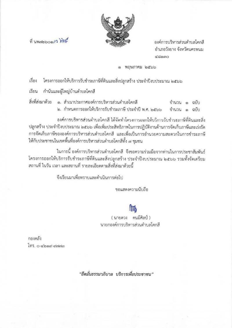 โครงการออกให้บริการรับชำระภาษีที่ดินและสิ่งปลูกสร้าง ประจำปีงบประมาณ 2566 ตั้งแต่วันที่ 8 - 16 พฤษภาคม พ.ศ. 2566